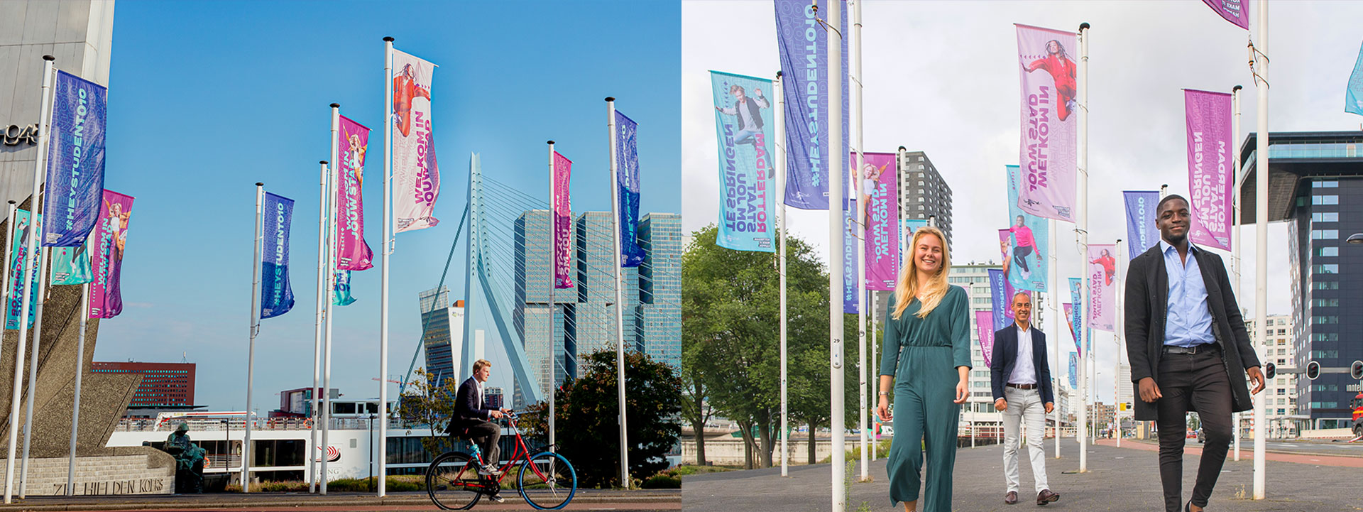 De communicatie aanpak werd door Wethouder Kashmi gelanceerd door het hijsen van talloze vlaggen aan de voet van de Erasmusbrug!