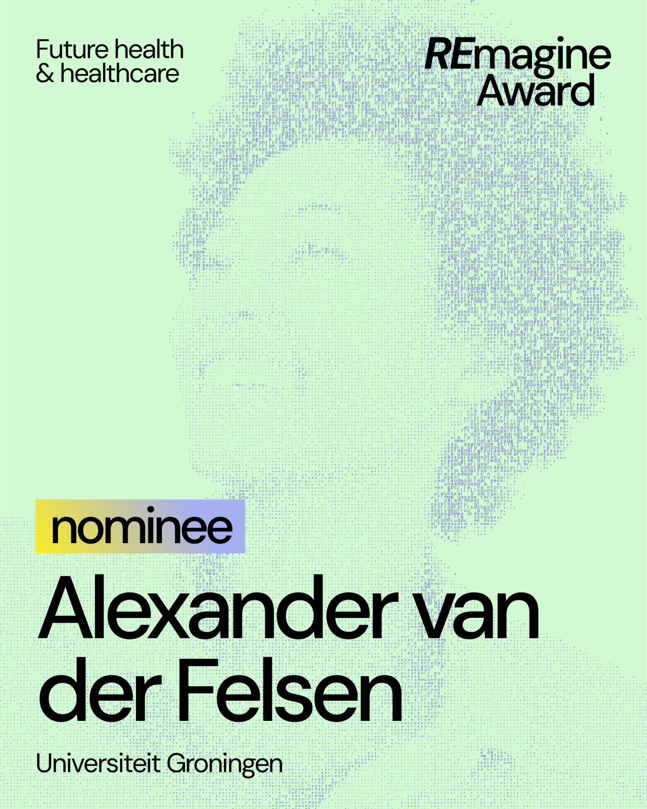 0to9 ontwikkelde een positionering voor de nieuwe scriptieprijs inclusief naam, visual identity, webdesign en een uitgewerkt communicatieplan. De nieuwe naam ‘REmagine Award’ benadrukt de creativiteit en vindingrijkheid van een nieuwe generatie afstudeerders. Zij staan ook centraal in de visual identity. We maakten gebruik van generative design technieken om portretten en andere afbeeldingen te maken op basis van de scriptieteksten.