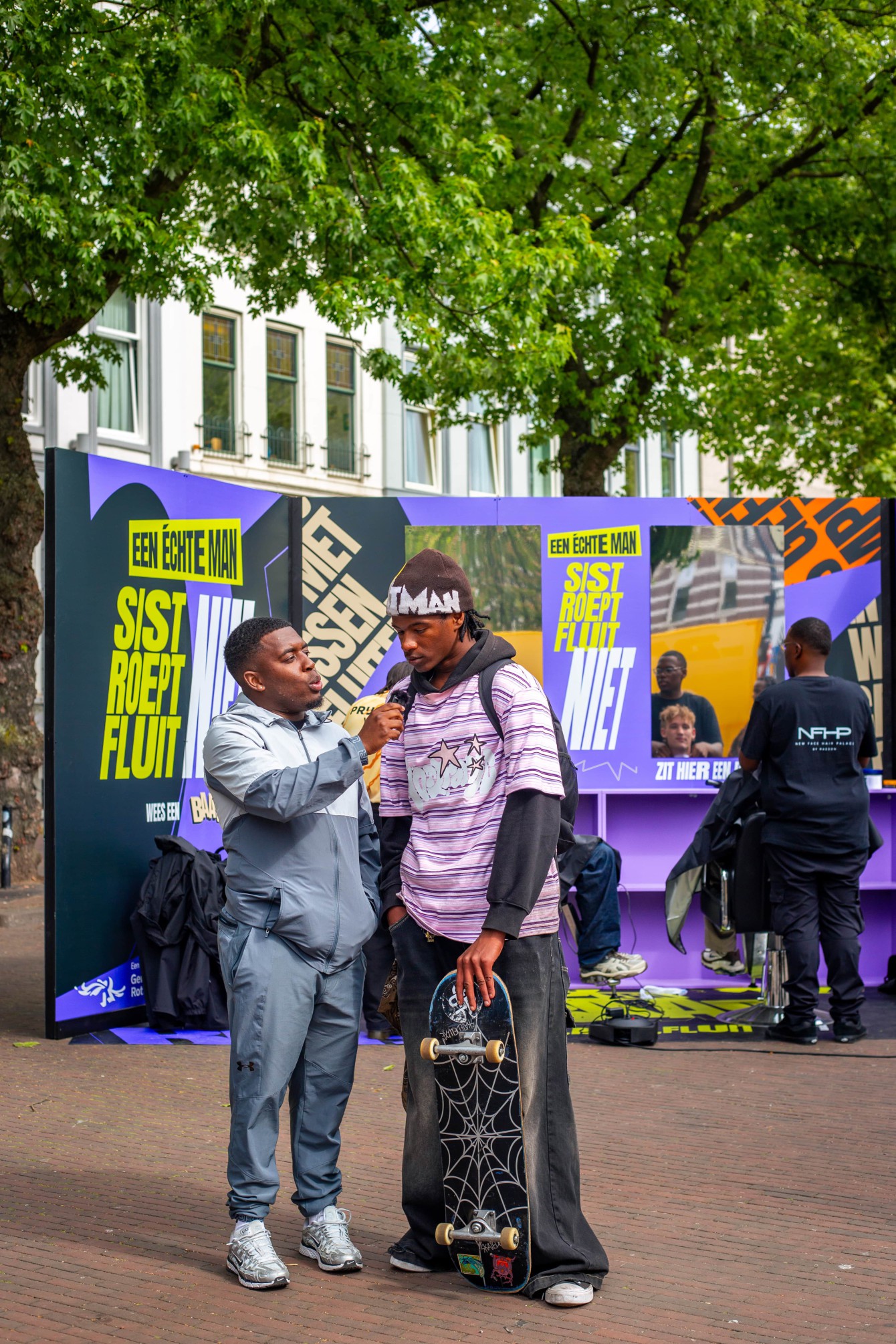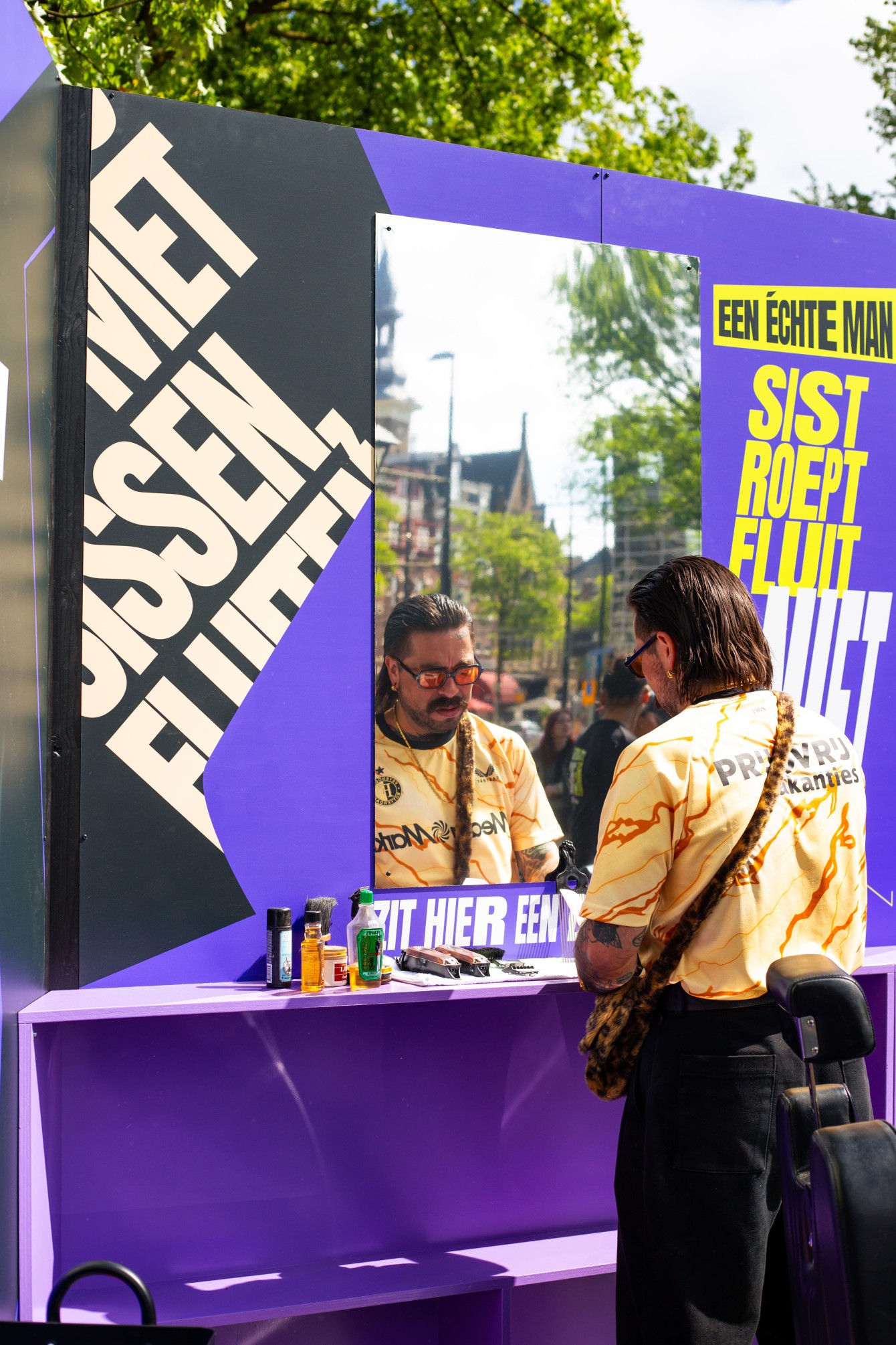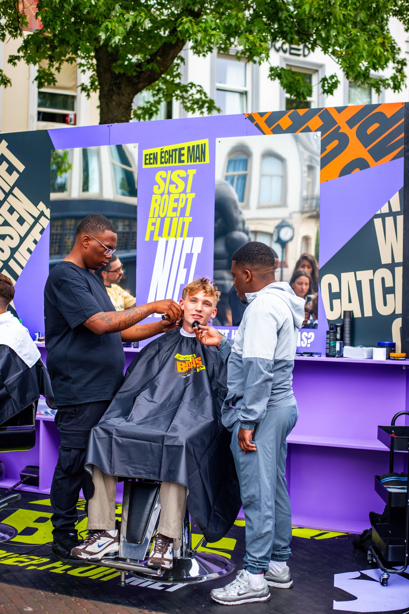 Om het gesprek op gang te brengen, bouwden we midden op straat een pop-up barbershop. Een omgeving waarin mannen zich op hun gemak voelen en het gesprek vanzelf op gang komt. Terwijl de tondeuse zoemde, ging Rarko (een bekende Rotterdamse influencer) het gesprek aan. Over fluiten, naroepen en roepen naar vrouwen op straat. Niet gescript, maar echt. De barbershop werd zo het decor voor eerlijke, open gesprekken en leverde content op die raakt.