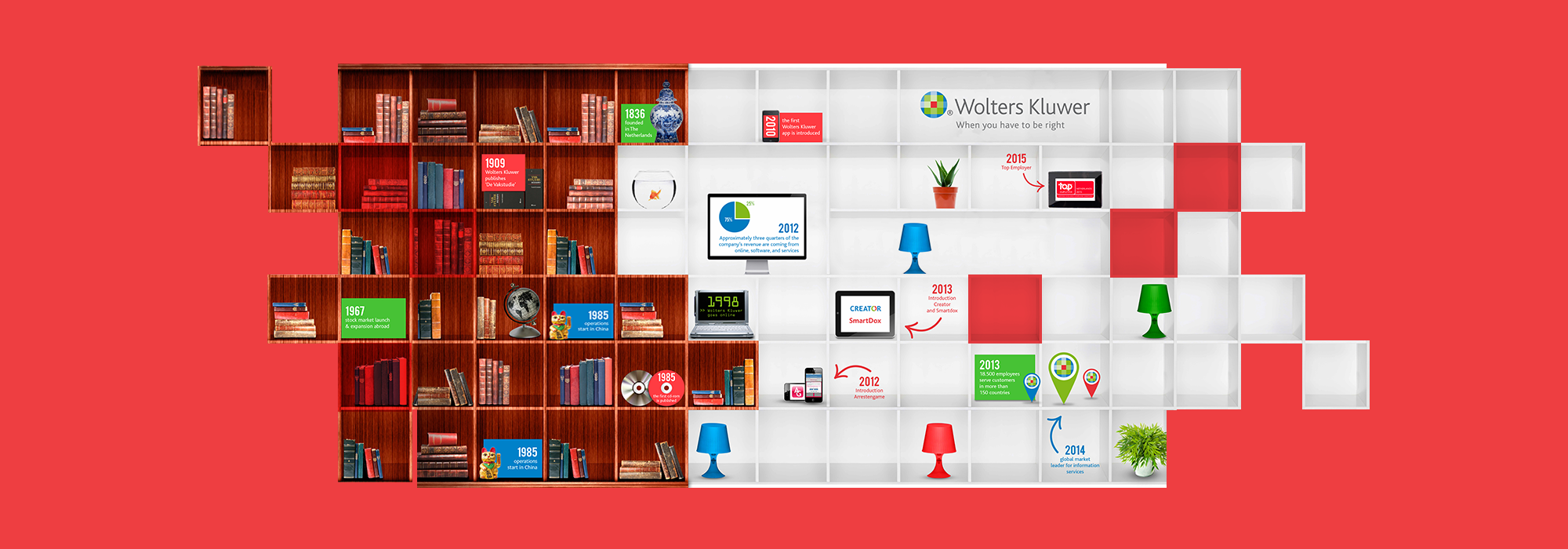 Wolters Kluwer biedt up-to-date informatie, software en tools aan juridisch, fiscale en overheidsprofessionals. Wolters Kluwer is een masterbrand, wat betekent dat producten, labels daar in de merkhiërarchie ondergeschikt aan zijn. 0to9 vertaalde de internationale strategie naar Nederland, inclusief de uitwerking van alle merkconsequenties in design.