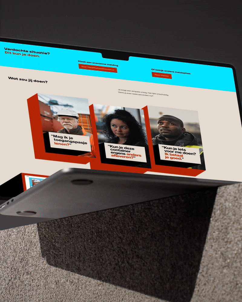 Via Meta, YouTube en Snapchat leiden we door naar een landingspagina met handelingsperspectief: signalen herkennen, veilig melden, of gebruikmaken van de toolkit voor bedrijven met posters en interne communicatiemiddelen. Daarnaast restylden we het logo en de huisstijl, zodat de campagne fris oogt en relevantie uitstraalt. En we bouwen door: binnenkort volgen nieuwe video’s met echte verhalen uit de haven.